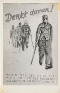 Sammlung Kunisch: Nationalratswahl 1949, Plakat der KPÖ und Linkssozialisten "Denkt daran! Wer gegen den Krieg ist, wählt die Liste des Friedens. Kommunisten und Linkssozialisten" [Kriegsversehrte mit Krücken]
