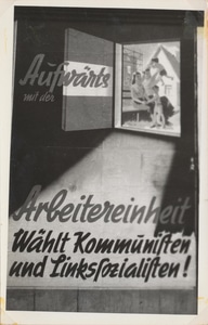 Sammlung Kunisch: Nationalratswahl 1949, Plakat der KPÖ und Linkssozialisten "Aufwärts mit der Arbeitereinheit - Wählt Kommunisten und Linkssozialisten!" [ein Fenster öffnet sich, hinter dem eine glückliche Familie vor einem ...