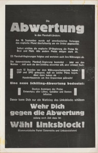 Sammlung Kunisch: Nationalratswahl 1949, Plakat der KPÖ und Linkssozialisten "Die Abwertung in den Marshall-Ländern: [...] Eine neue Schilling-Abwertung bedeutet: Starkes Ansteigen der Preise Entwertung aller Löhne, Gehälter u...