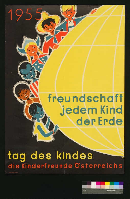 1955 Freundschaft jedem Kind der ErdeTag des Kindesdie Kinderfreunde Österreichshalbe gelbe Weltkugel auf schwarzem Hintergrund, am Rand der Kugel Kinder verschiedenster Nationalität