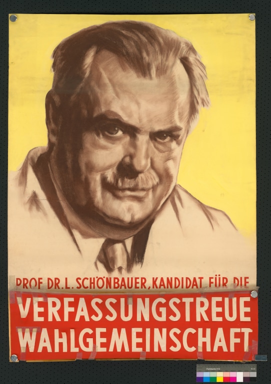 Prof. Dr. L. Schönbauer, Kandidat für die Verfassungstreue Wahlgemeinschaftgezeichnetes Porträt von Schönbauer in braun-weiß, gelber Hintergrund