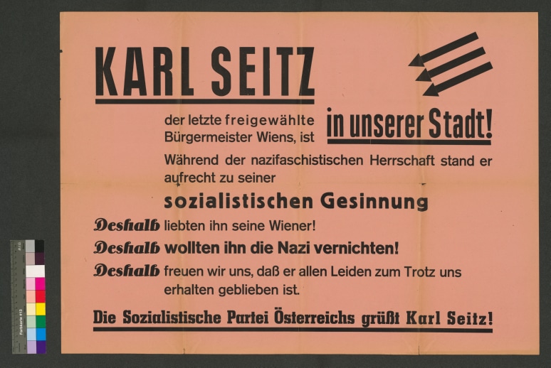 Karl Seitz der letzte freigewählte Bürgermeister Wiens, ist in unserer Stadt!Die Sozialistische Partei Österreichs grüßt Karl Seitz!Schwarze Schrift auf rosa Hintergrund