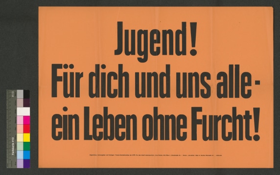 Jugend! Für dich und uns alle - ein Leben ohne Furcht!schwarze Schrift auf orangem Hintergrund