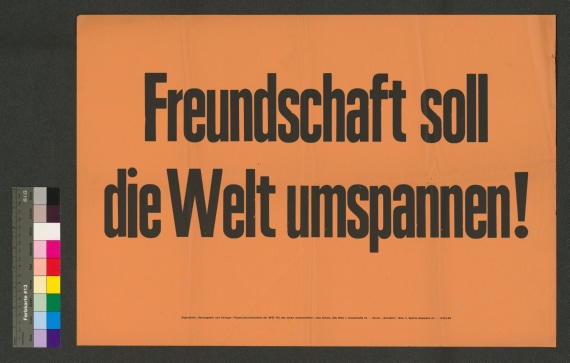 Freundschaft soll die Welt umspannen!schwarze Schrift auf orangem Hintergrund
