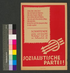 Schaffende geistig und körperlich Werktätige! Euch ruft zur Aufbauarbeit die Sozialistische Partei!Drei Pfeile, beige/rot