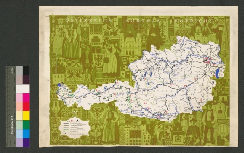 Österreich Austria AutricheLandkarte von Österreich mit (Bundes)Bahnlinien, Seilbahnen, PostautoverbindugenIm Hintergrund in diversen Grüntönen Männer und Frauen in Tracht, Wahrzeichen von Österreich, Bundeslä...