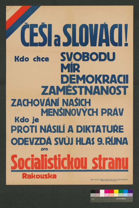 Cesi a Slovaci!1949, Plakat der SPÖ auf tschechisch "CESI a SLOVACI! [...] pro Socialistickou stranu Rakouska"blaue und rote Schrift