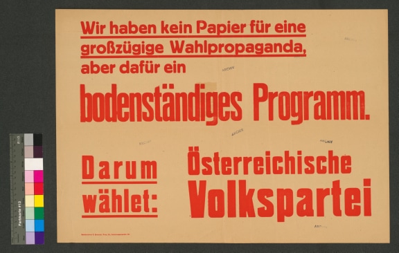 Wir haben kein Papier für eine großzügige Wahlpropaganda, abe dafür ein bodenständiges Programm.Darum wählet: Österreichische Volksparteirote Schrift