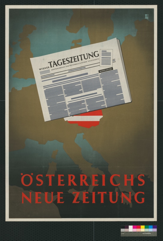 Österreichs neue ZeitungKarte von Europa, Österreich in rot-weiß-rot, Abbildung Zeitung "Wiener Tageszeitung"