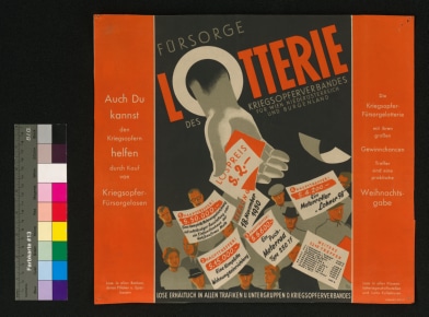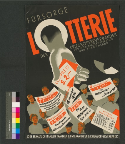 W. Harnisch: "Fürsorgelotterie des Kriegsopferverbandes". Bild: Aus dem "O" des Wortes Lotterie streckt sich eine Hand mit dem Lospreis öS 2.- heraus. Im unteren Teil eine Menschenmenge mit den Preisen die zu gewinnen sind.V...