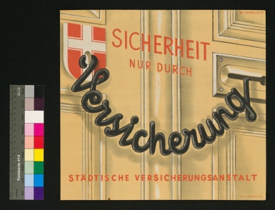 W. Harnisch: " Sicherheit nur durch Versicherung" - Städtische Versicherungsanstalt. Bild: Ausschnitt einer Türe - links oben: Wiener Wappen.