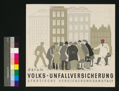 W. Harnisch: " ... darum Volks - Unfallversicherung". Bild: Straße mit Häusern - davor Menschengruppe die einen Unfall beobachten.