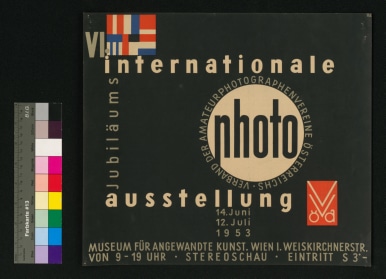 W. Harnisch: " Internationale Photoausstellung" im Museum für angewandte Kunst.Bild:auf schwarzem Untergrund die Schrift. "photo" in einem weißen Kreis rundherum:"Verband der Photografenvereine Österreichs"