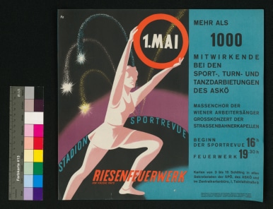 W. Harnisch: " 1. MAI" - mehr als 1000 Mitwirkende.Sport-,Turn- und Tanzdarbietungen des ASKÖ. Bild Turnerin die einen Ring mit der Inschrift 1.MAI trägt. Stadion Sportrevue, Riesenfeuerwerk