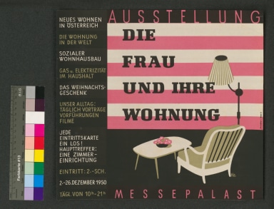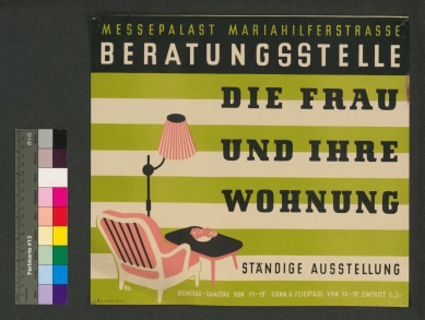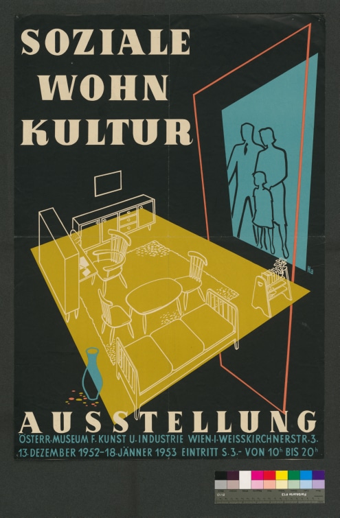W. Harnisch: "Soziale Wohnkultur " Ausstellung ->österr. Museum f. Kunst u. Industrie. Bild Wohnzimmer mit moderner Einrichtung.
