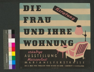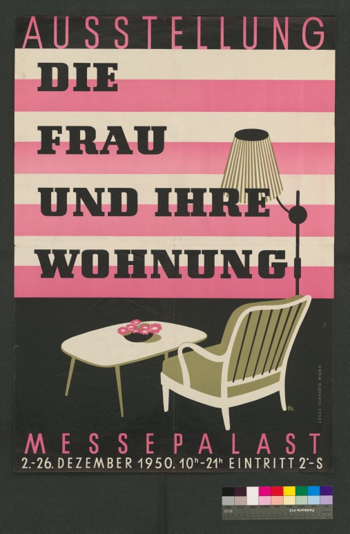 W. Harnisch: " Die Frau und Ihre Wohnung " Ständige Ausstellung und Beratung im Messepalast. Bild Tisch ,Stehlampe u. Fauteuil im modernen Design.