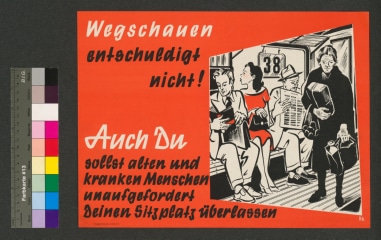 W. Harnisch: " Wegschauen entschuldigt nicht!" Auch DU sollst alten und kranken Menschen unaufgefordert Deinen Sitzplatz überlassen. Bild: Junge Frau und junger Mann sitzen in der Straßenbahn und wenden sich von einer alten Frau...