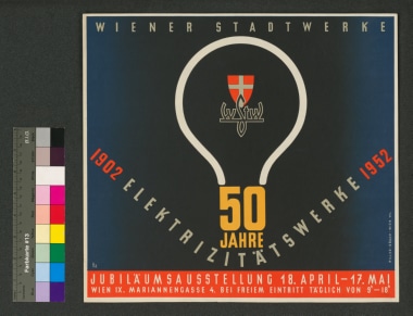 W. Harnisch: " Wiener Stadtwerke - 50 Jahre Elektrizitätswerke 1902 - 1952. Jubiläumsausstellung in der Mariannengasse.Bild Glühlampe (Fassung:50 Jahre - im Lampenteil: Wappen der Gemeinde Wien und WStW)