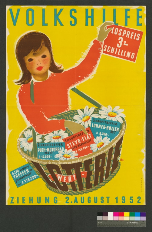 W. Harnisch: " Volkshilfe Lotterie" Lospreis öS 3.-Bild:Junge Losverkäuferin mit Geschenkkorb.Im Korb Blumen und Tafeln mit den Hauptoreisen.