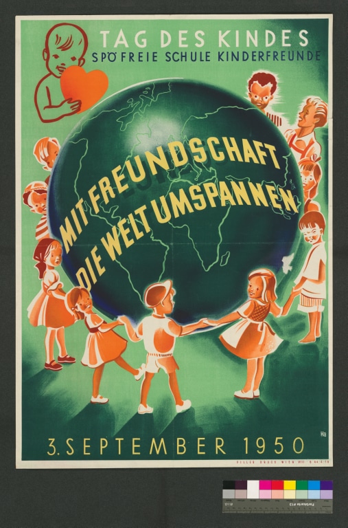 W. Harnisch: " Mit Freundschaft die Welt umspannen" Tag des Kindes - Freie Schule Kinderfreunde. 3. September 1950. Bild: Kindergruppe umspannt eine Erdkugel.