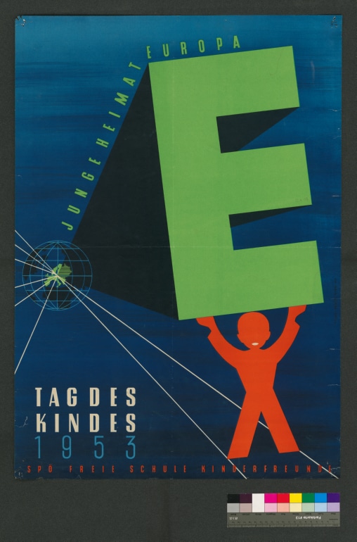 W. Harnisch: " Junge Heimat Europa " Tag des Kindes. Bild : Kind hält ein großes "E" in die Höhe.