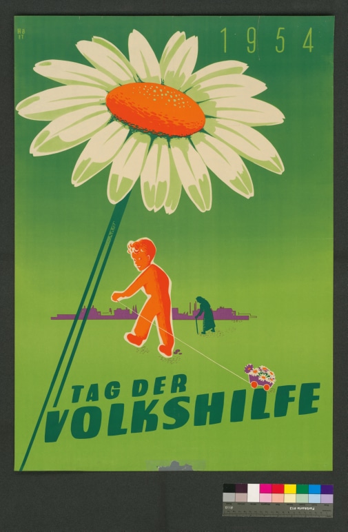 W. Harnisch: " Tag der Volkshilfe " Bild: Kleiner Bub zieht ein kleines Wagerl mit Blumen hinter sich nach. Im Vordergrund große Margerite - im Hintergrund Umrisse einer Stadt und einer alten Frau.