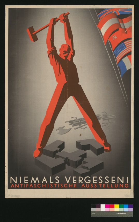"NIEMALS VERGESSEN " Antifaschistische Ausstellung. Bild Mann der mit einem grossen Hammer ein Hakenkreuz und ein Liktorenbündel zerschlägt.[ident mit 4/18]