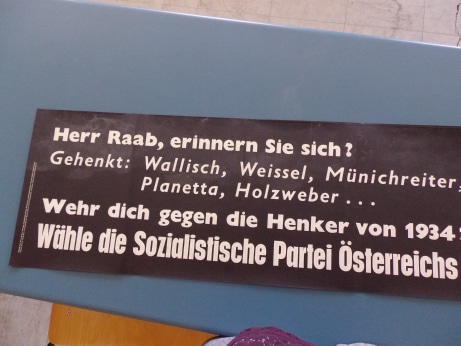 Plakatstreifen: "Herr Raab erinnern Sie sich?"Gehenkt: Wallisch Weissl, Münichreiter, Planetta, Holzweber.....wähle die Sozialistische Partei!Schwarzer Plakatstreifen mit weißer Schrift.(2 Expl.)