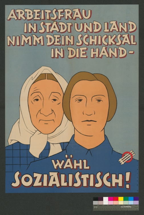 Text:"Arbeitsfrau in Stadt und Land nimm dein Schicksal in die Hand - wähl Sozialistisch!"Bild: Alte Frau mit Kopftuch steht hinter junger Frau. Beide blicken aus dem Bild heraus und sind nur bis zu den Schultern zu sehen. 📆︎1945 ⊾︎84x60 cm ︎︎︎️️🖈Verein für Ges...
