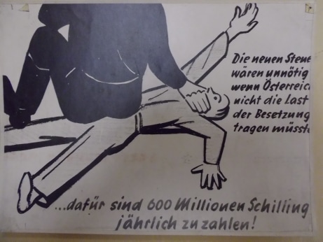 Text:"Die neuen Steuern wären unnötig wenn Österreich nicht die Last der Besetzung tragen müsste ...dafür sind 600 Millionen Schilling jährlich zu zahlen!"Bild: Auf einem Mann, der am Boden liegt, sitzt ein Mensch, von ...