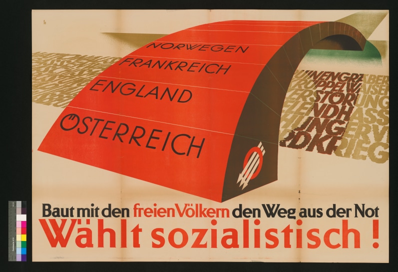 Text:"Baut mit den freien Völkern den Weg aus der Not / Wählt sozialistisch!"Bild: Fluß wird aus folgenden Worten gebildet:"Nationalsozialismus Ruinen Krüppel Gräber Waisen Zerstörung Elend Hass Hunger Krieg (...)"Ü...