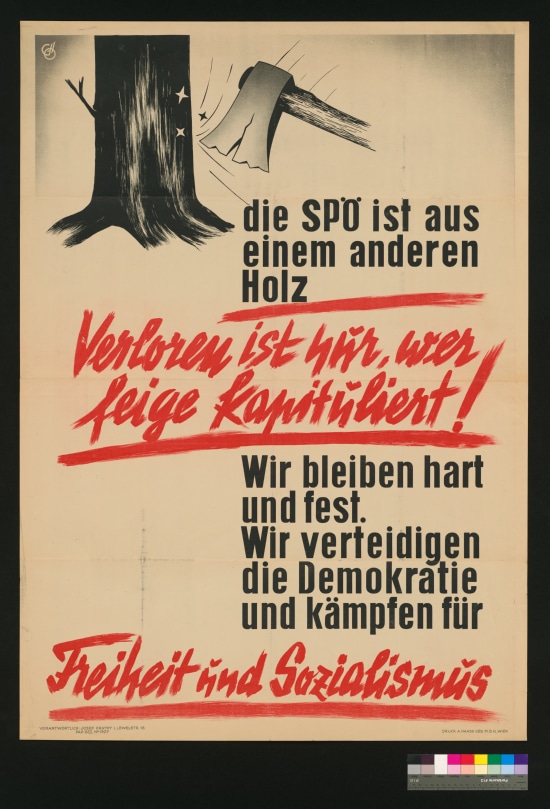 Text:"die SPÖ ist aus einem anderen Holz / Verloren ist nur, wer feige kapituliert! / Wir bleiben hart und fest. Wir verteidigen die Demokratie und kämpfen für Freiheit und Sozislismus"Bild: Baumstamm und beschädigte Axt.<...