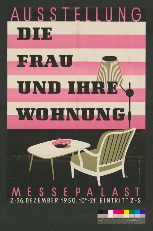 Text."Ausstellung / Die Frau und ihre Wohnung / Messepalast / 2.-26. Dezember 1950. 10h-21h Eintritt 2.-S"Bild: Stehlame, Sessel und Tisch mit Blumenschale.Schwarz, weiß, olivgrün, rosa.