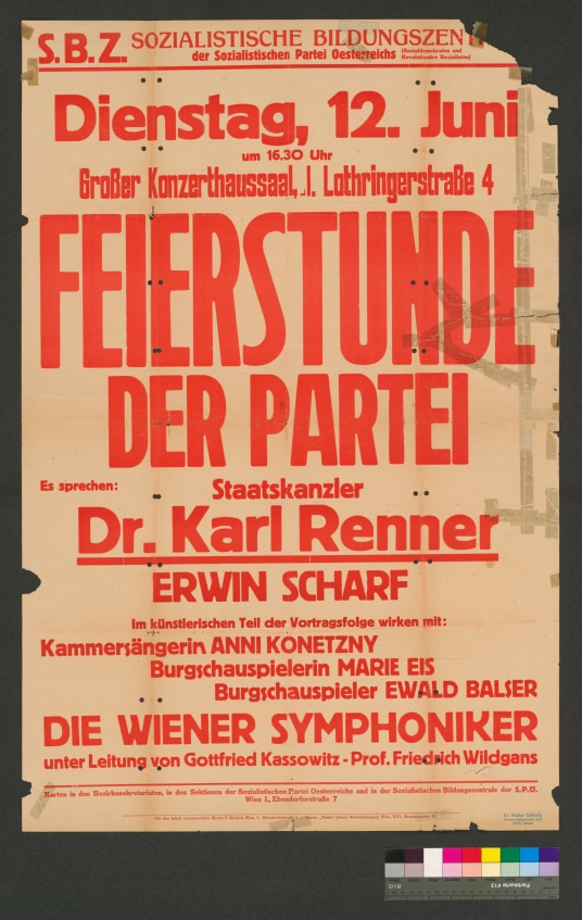 Text."S.B.Z. Sozialistische Bildungszentrale / der Sozialistischen Partei Oesterreichs (Sozialdemokraten und Revolutionäre Sozialisten) /Dienstag, 12. Juni / um 16.30 / Großer Konzerthaussaal, I.Lothringerstraße 4 / Feierst...