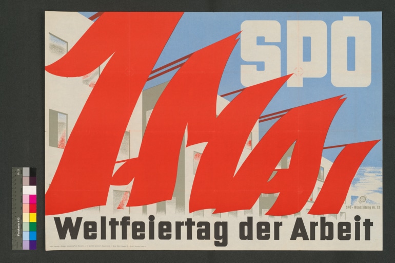 Bild: Rote Fahnen. Transparente mit der Aufschrift:"Ganz Österreich feiert den 1. Mai" das Ö wird vom SPÖ-Logo gebildet. Schrift: weiß. Bild: weiß, rot, blau.