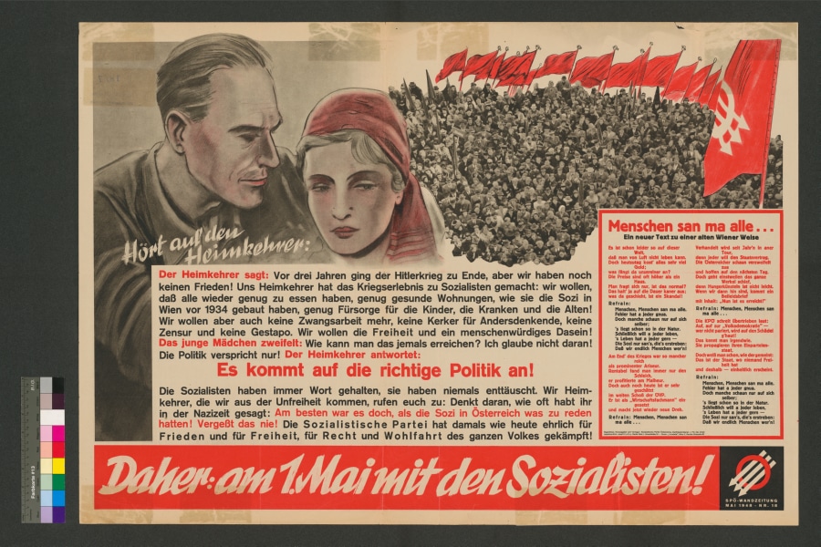 SPÖ Wandzeitung Nr. 18, Zeichnung, Foto, schwarzer und roter Text. Gezeichnet: Mann und junge Frau mit rotem Kopftuch, Foto: Menschenmenge, im Hintergrund rote Fahnen.Hört auf den Heimkehrer. Es kommt auf die richtige Politi...