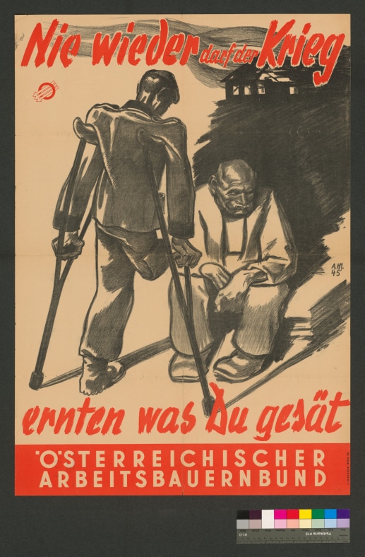 Text: "Nie wieder darf der Krieg/ ernten was Du gesät/ Österreichischer Arbeitsbauernbund". Bild: Sitzender alter Mann, der die Hände ineinander gelegt und den Blick gesenkt hat. Vor ihm steht (mit dem Rücken zum Betrachter) s...