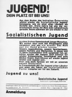 Text: "Jugend! Dein Platz ist bei uns! / Aus dem Boden des befreiten Österreichs wächst wieder die Sozialistische Jugendbewegung, wie sie einst allen Ländern ein Vorbild war. Viele Jahre hat uns der verbrecherische Krieg der Na...