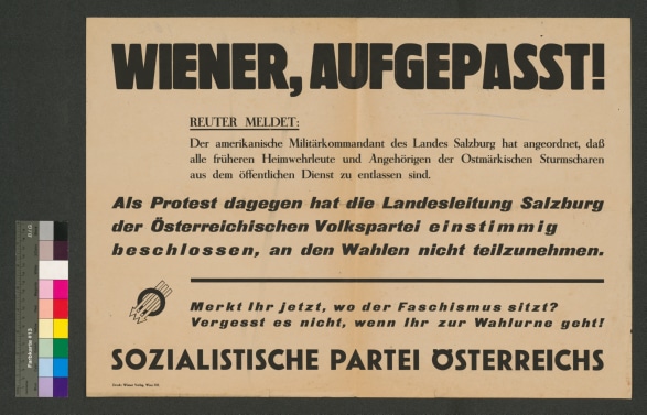 Text: "Österreicher! / In den Jahren der Demokratie waren wir / Kämpfer für die Rechte des Volkes. / Als Sozialdemokraten haben wir im Roten Wien ein Aufbauwerk vollbracht wie es die kapitalistische Welt noch nie gesehen hatte....