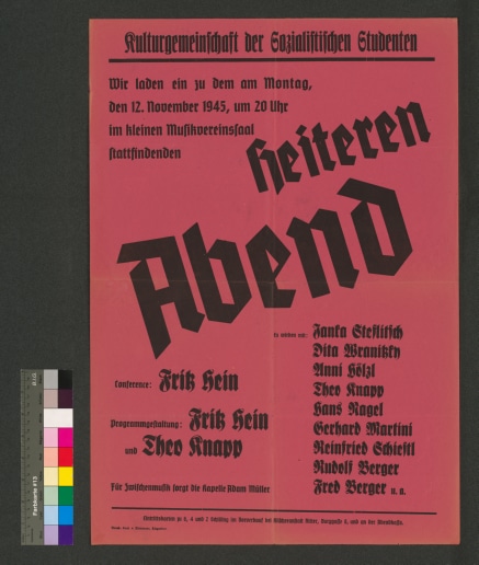 "Heiterer Abend" am 12.1.12.1945 im kleinen Musikvereinssaal - Kulturgemeinschaft der sozialistischen Studenten.Mit Fritz Hein, Theo Knapp u.a.