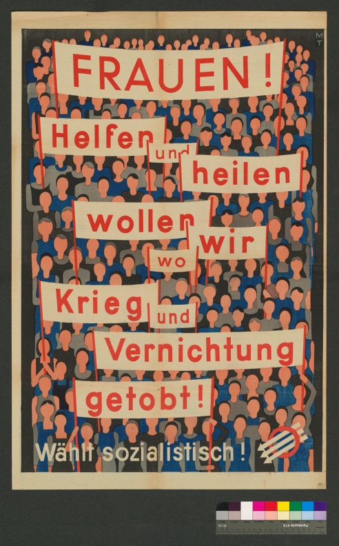 Text:"Frauen! Helfen und heilen wollen wir wo Krieg und Vernichtung getobt! Wählt sozialistisch!" Bild: Die gesamte Bildfläche wird von einem Demonstrationszug, der aus Frauen gebildet wird, ...