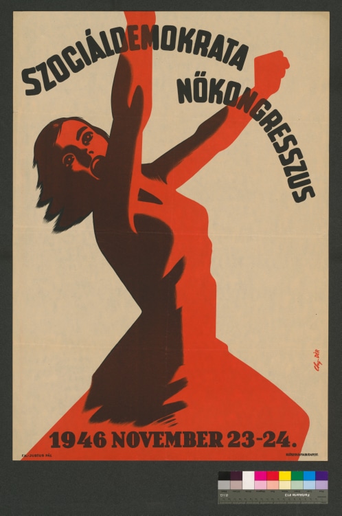 Text:"Szociáldemokrata Nökongrresszus / 1946 November 23-24."Bild: Rote Frau mit nach oben gestreckten Armen.Schrift: Schwarz. Bild: weiß, rot, schwarz.