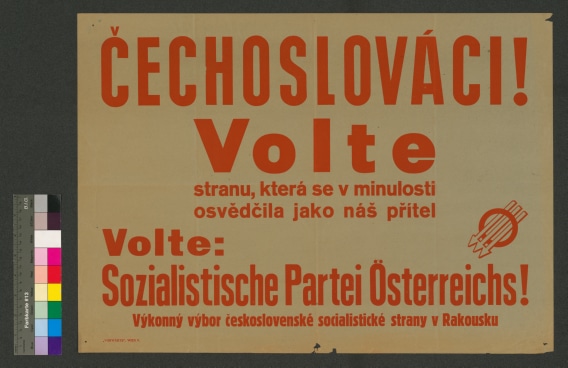 Text:"Cechoslováci! Volte stranu, která se v minulosti osvedcila jako nás prítel Volte: Sozialistische Partei Österreichs! Vykonny vybor ceskoslovenské socialistické strany v Rakousku"Bild: SPÖ-Logo.Grün, rote Sch...