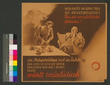 Bild: Dicker Mann mit Zigarre sitzt Zeitung lesend in einem Stuhl. Eine Frau schenkt ihm Kaffe(?) ein. Im Hintergrund: Silhouette Salzburgs.SPÖ-Logo.Text:"Wer hatte im April 1945 / die Privatinitiative? / Nur der sozialis...