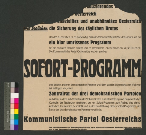 Text:"(...) ungeteiltes und unabhängiges Oesterreich / Wir brauchen die Sicherung des täglichen Brotes / Um das zu erreichen, ist es notwendig, daß alle demokratischen Kräfte des Landes sich auf / ein klar umrissenes Programm ...