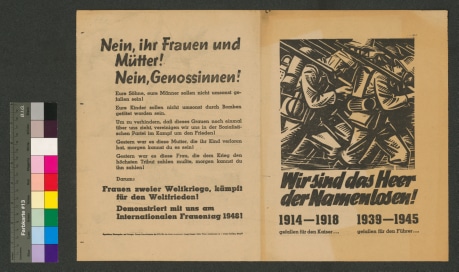 Zweiseitiger Folder. Schwarze Schrift auf weißem Hintergrund. Vorderseite: Wir sind das Heer der Namenlosen. 1914 - 1918 gefallen für den Kaiser. 1939 - 1945 gefallen für den Führer. Innenseite: ... und ich bin einer v...