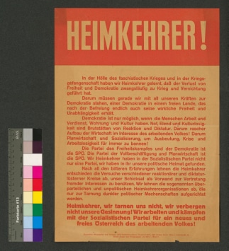 Roter Text auf weißem Hintergrund:Heimkehrer!In der Hölle des faschistischen Krieges und in der Kriegsgefangenschaft haben wir Heimkehrer gelernt, daß der Verlust von Freiheit und Demokratie zwangsläufig zu Krieg und V...