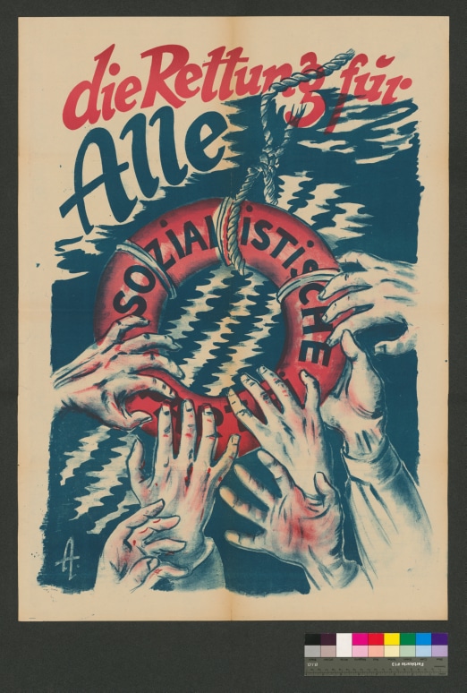 Bild: Rettungsring mit der Aufschrift "Sozialistische Partei". An diesen Rettungsring klammern sich Hände, andere greifen danach.Text:"die Rettung für Alle" Bild und Schrift: blau und rot.(2 Expl.)