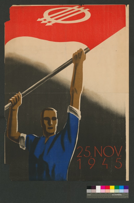 Bild: Mann in blauem Arbeitsanzug schwingt rote Fahne mit dem SPÖ-Logo der drei PfeileText: "25. Nov.1945"Rote Schrift. Bild: grau, blau, braun, rot.