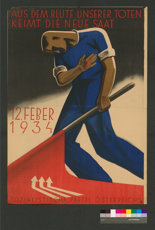 Bild: Mann in blauem Arbeitsanzug hält die recht Hand auf eine blutende Wunde in der Herzgegend. In der linken Hand trägt er eine zu Boden gesunkene rote Fahne mit dem alten SPÖ-Logo (Drei Pfeile ohne Kreis). Der Kopf des Manne...